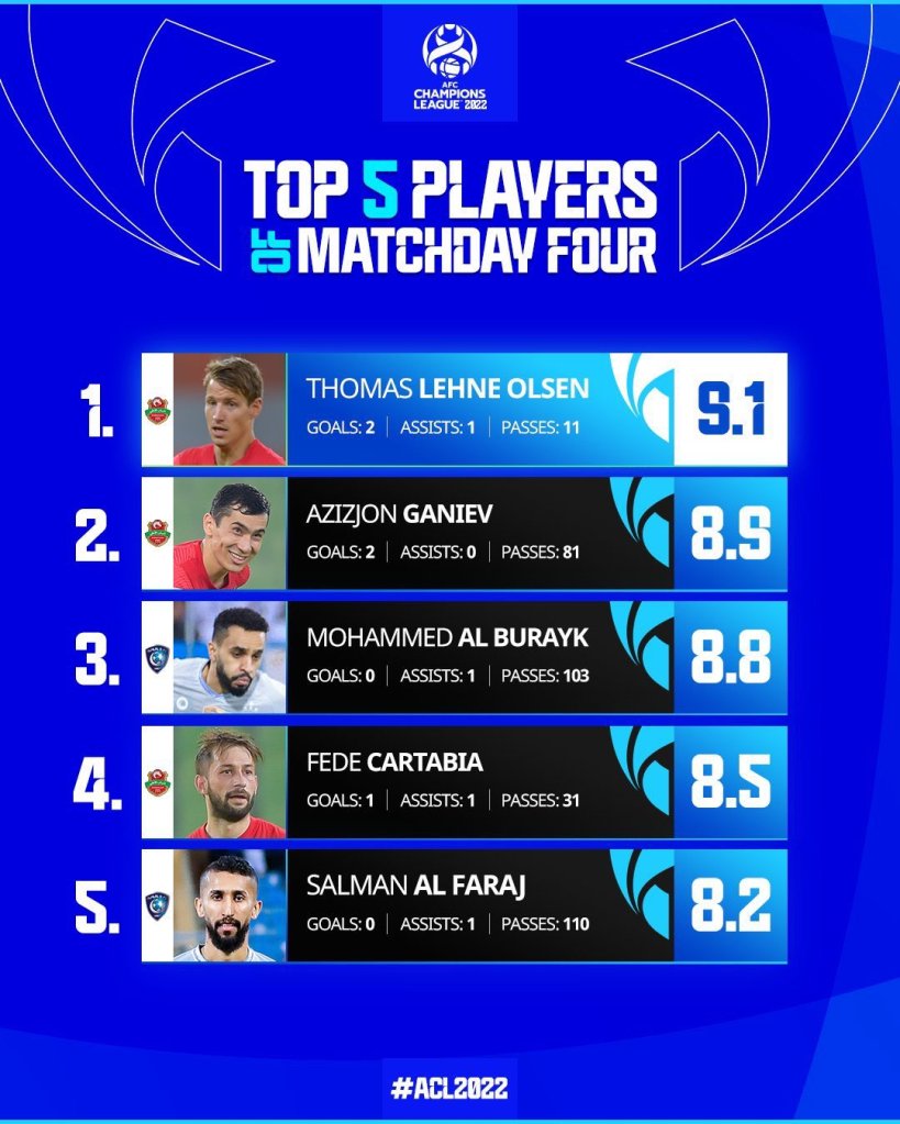 - أعلى خمس لاعبين تقييم خلال الجولة الرابعة في دوري أبطال آسيا 2022م :• محمد البريك الثالث “8.8”• سلمان الفرج الخامس”8.2″